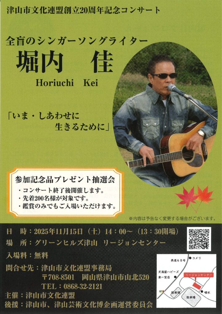 津山市文化連盟の創立20周年を記念して、全盲のシンガーソングライターの堀内佳さんを招き、コンサートを開催します。